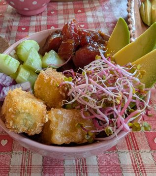 Disposez le riz au fond du bol, ajoutez dessus : le concombre, l’avocat, l’oignon rouge, les croquants Reblochon et le thon mariné. Ajoutez en option des pousses de radis. Versez la sauce salade, c’est prêt !
